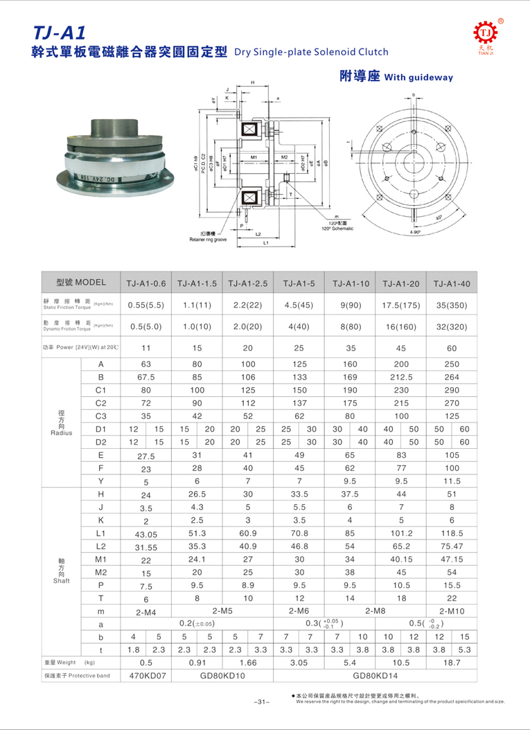 天機傳動工業單片電磁離合器TJ-A1型號由銜鐵(電樞板)、定子、轉子、板型彈簧片、磁性線圈、來令片、軸承、鐵導座等元件構成,統一使用DC24V,標準規格0.6-40KG。
